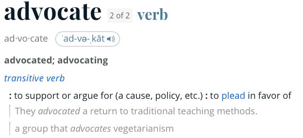 Merriam Webster defines the verb “advocate” as “to support or argue for (a cause, policy, etc.)” and “to plead in favor of” something.